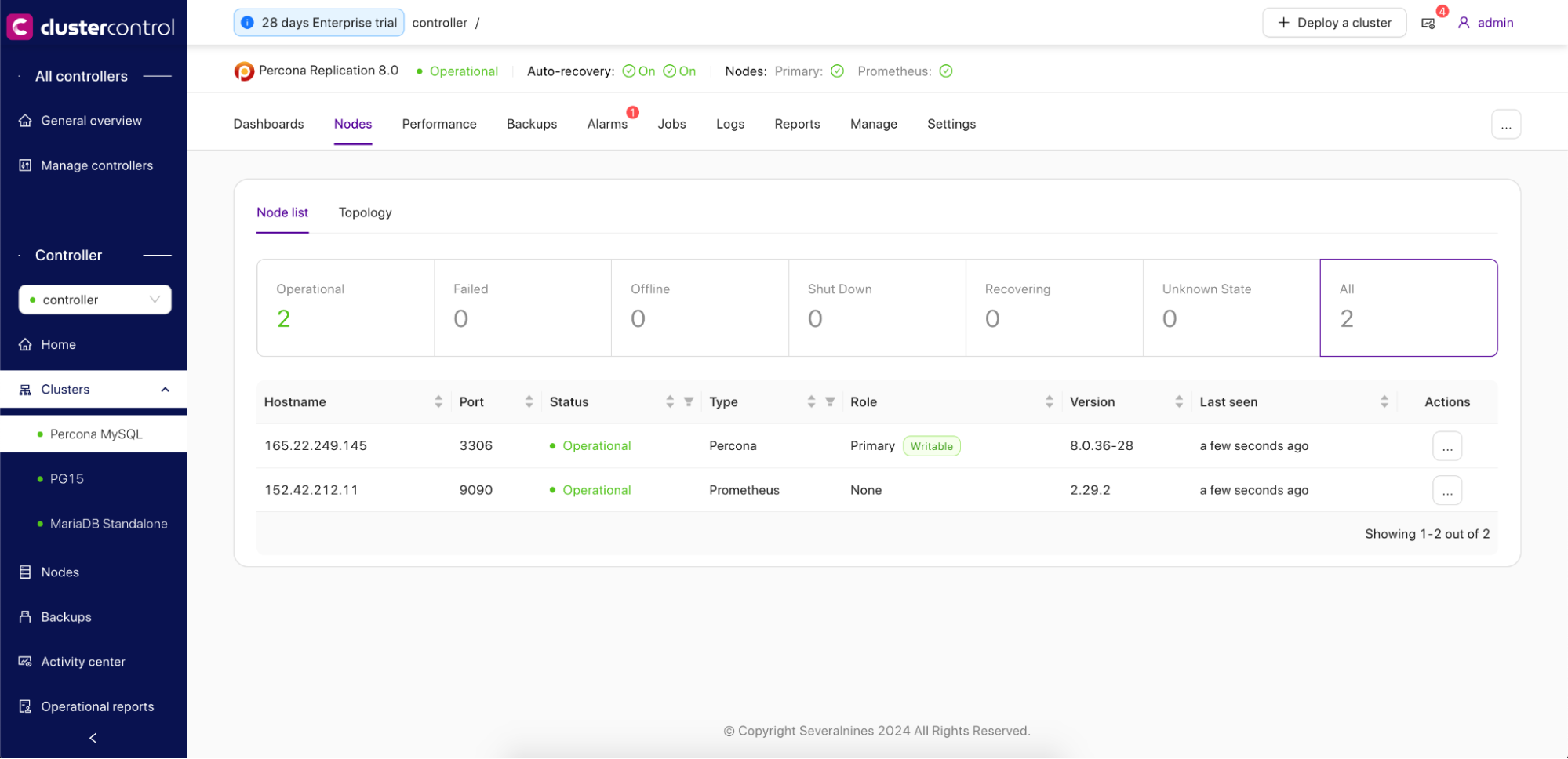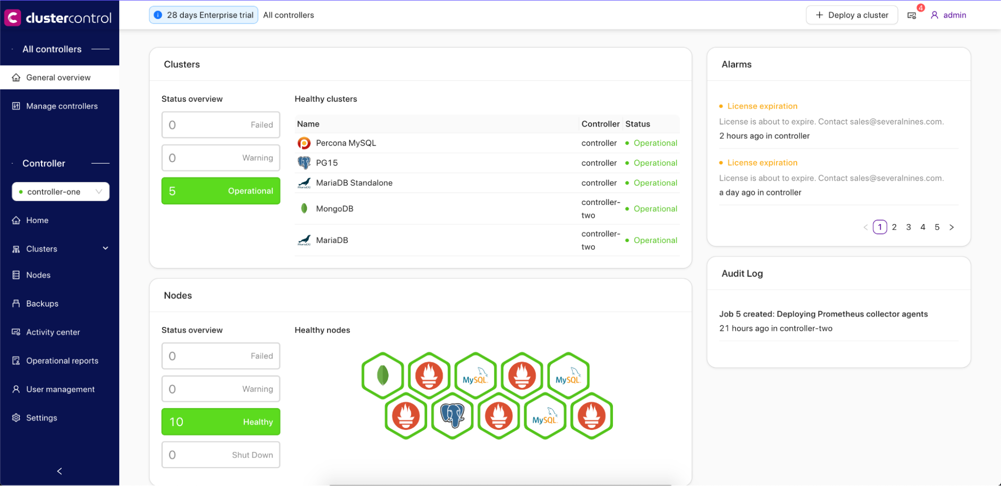- The Controllers’ Overview page features a dashboard that presents aggregated information on registered or managed CMON controllers, providing insights into the status of controllers, ongoing jobs, alarms, and backups, as well as the status of the database clusters and nodes.
