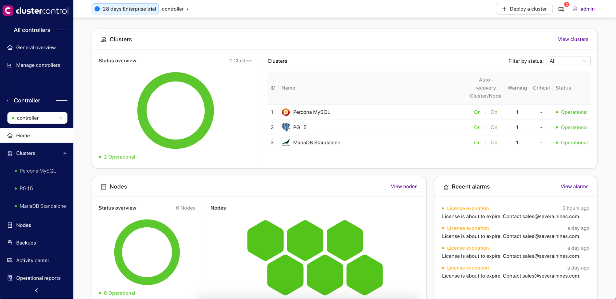 After all the ClusterControl has been added to the ClusterControl GUI, the Operations Center can give information about the status related to the Clusters, Nodes, and Controllers in the Overview Page: