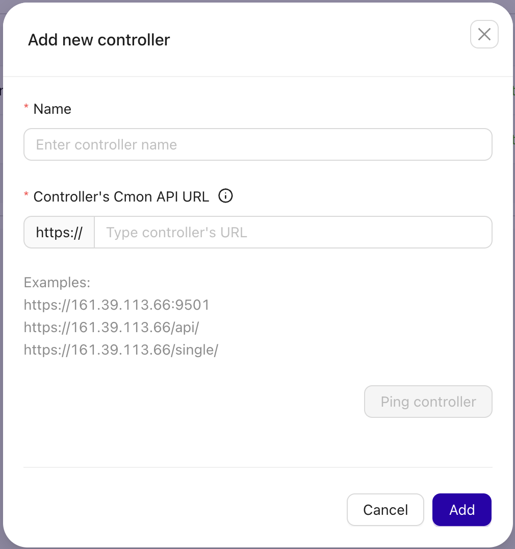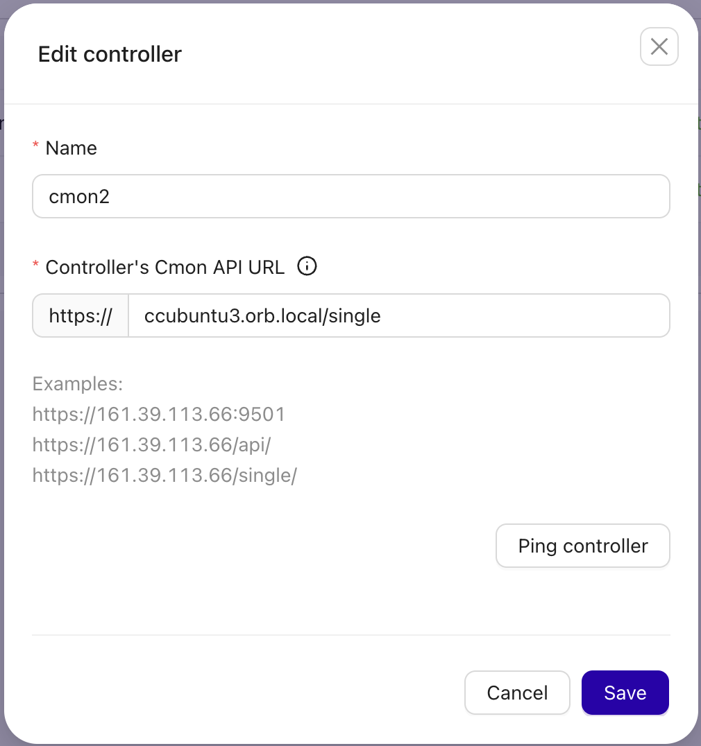 - Provide the controller name and Controller's Cmon API URL. For example,