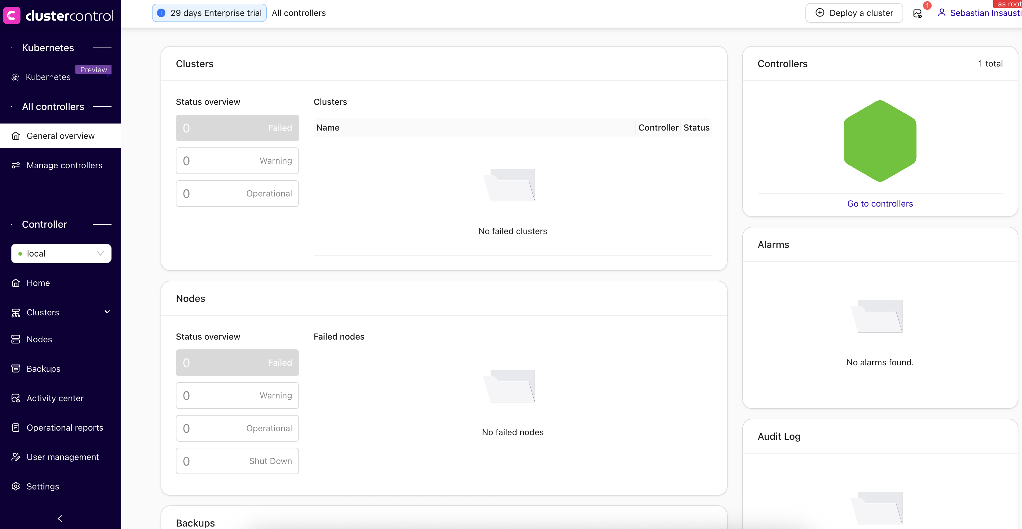 - The Controllers’ Overview page features a dashboard that presents aggregated information on registered or managed CMON controllers, providing insights into the status of controllers, ongoing jobs, alarms, and backups, as well as the status of the database clusters and nodes.