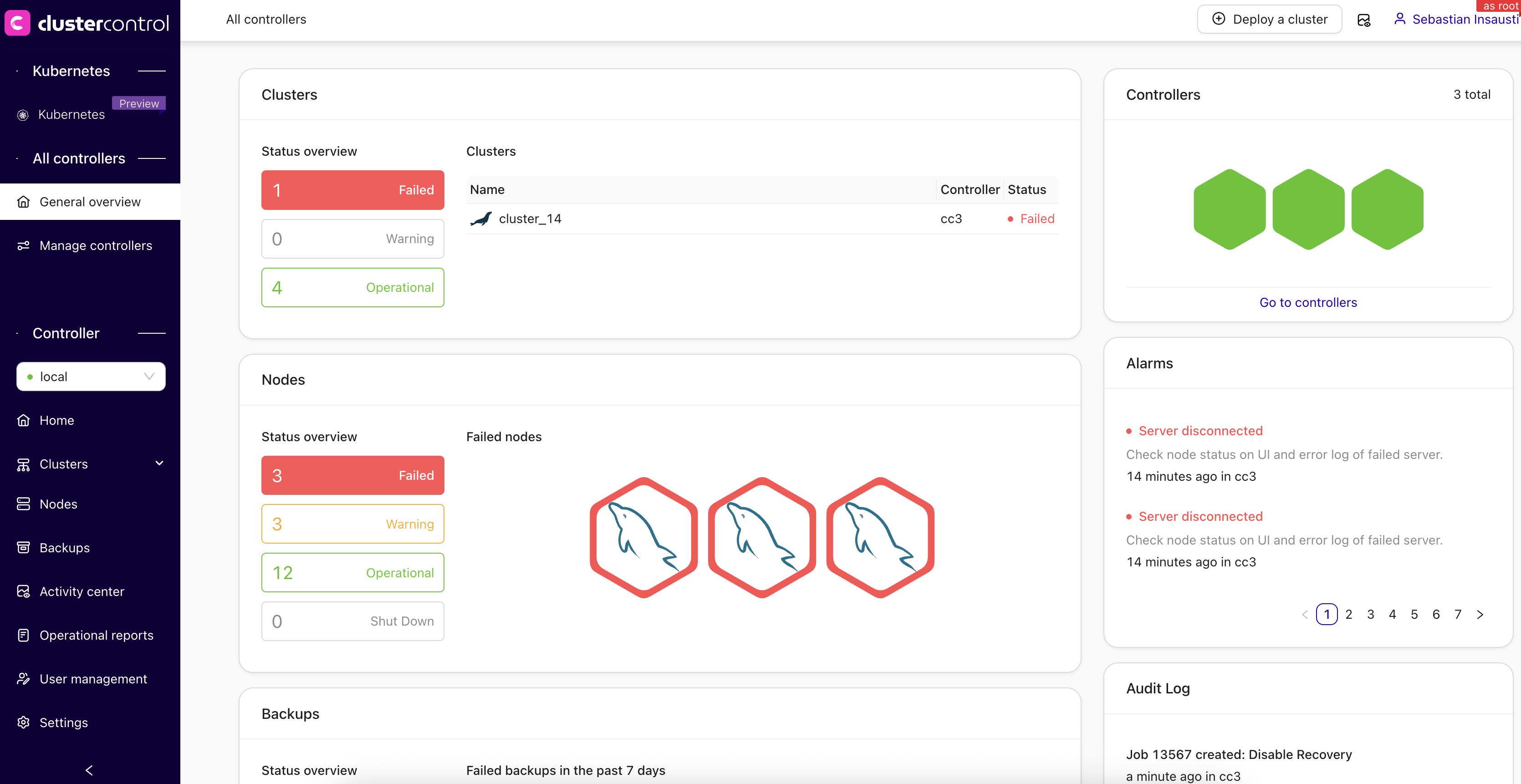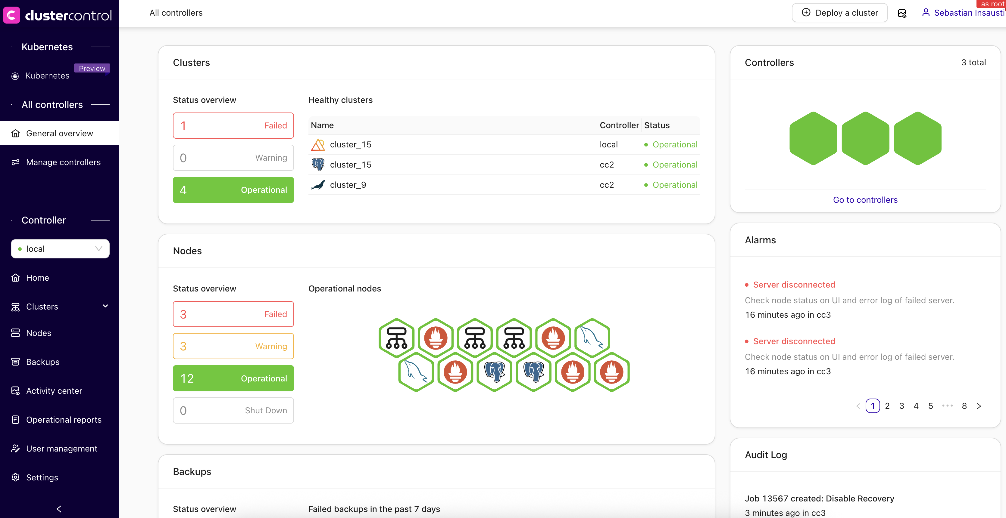 The Controllers’ Overview dashboard provides a global view of: - Controller health and job status - Cluster alarms and backups - Node-level availability - Active jobs per controller