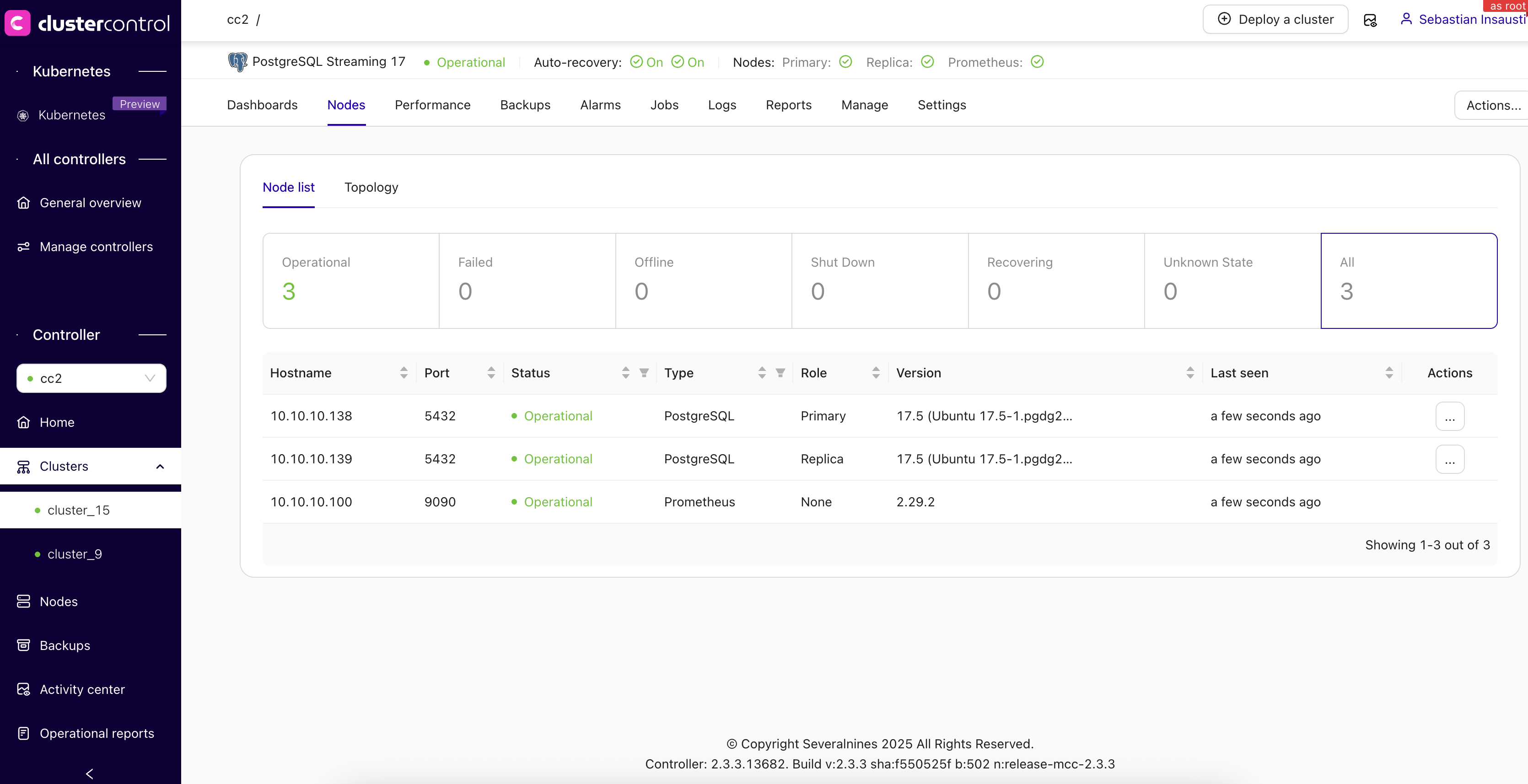 - The web user interface allows users to select the “Active CMON Controller”, which determines the information displayed throughout the application (excluding the Controllers’ Overview) and directs user actions for clusters or nodes to the selected CMON Controller.